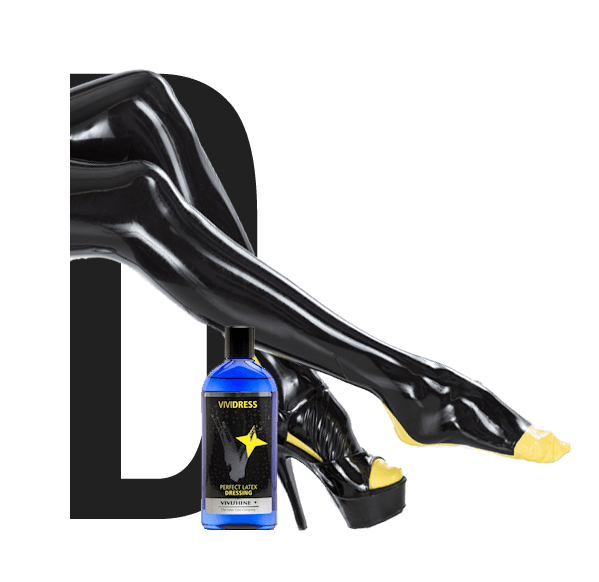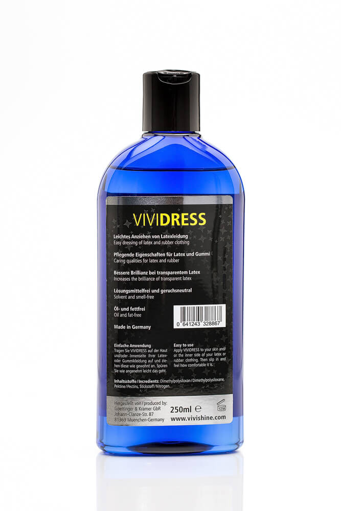 VIVIDRESS ist daher besonders flüssig und lässt das Latex beim Anziehen spielerisch über die Haut gleiten. Durch leichten Druck auf die ovale Flasche lässt es sich gut dosieren und direkt auf die Innenseite das Latex oder die Haut auftragen. Es benetzt die Haut unter dem Latex und sorgt somit auch beim Tragen dafür, dass die Kleidung nicht auf der Haut festklebt sondern gleiten kann. Dies verhindert partielle Spannungen oder übermäßiges Dehnen und beugt damit Rissen vor. Auch kann das Latex selbst nach vielen Stunden wieder leicht abgestreift werden ohne zu zerreißen.